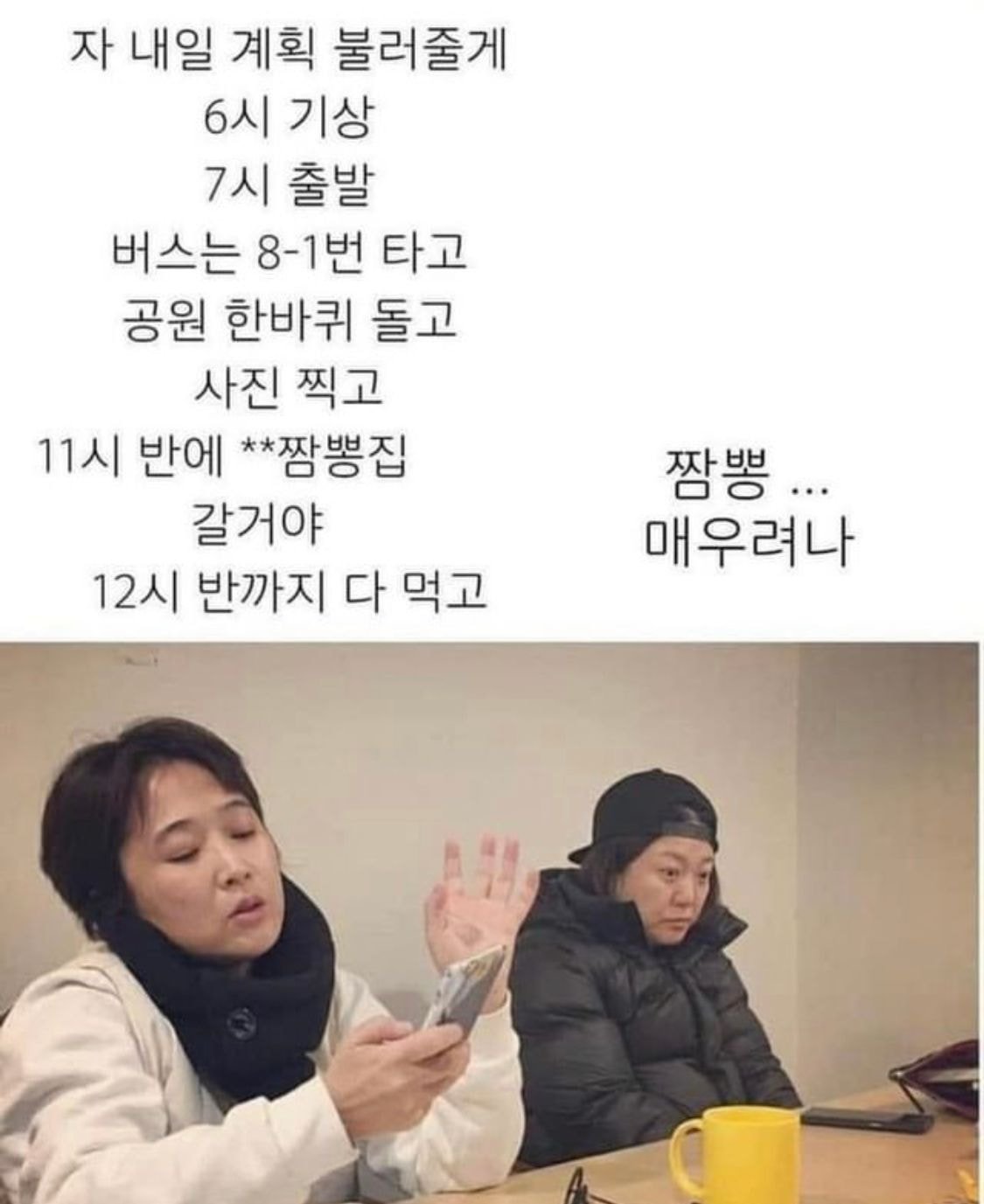 | Q. 업무처리 (j) 계획부터 세운다. Q. 여행 (j) 계획한 대로. 스케쥴에 따라 움직인다. (친구의 앞머리가 너무 길어서 눈을 찌르는 상황) (j) 너 앞머리 좀 잘라야겠다! |